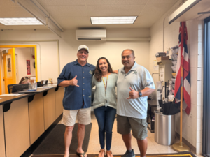 Clint Imholte (left), Chairman of the POI Foundation and Henry Pedrina (right), Secretary and Treasurer of the POI Foundation, deliver a check for $500 to Mrs. Nancy Kittelson (center), Counselor at Mililani High School, to support various school programs.